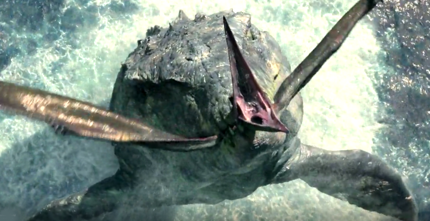 The pterosaurs are, I’ll admit, pretty darn nasty (though why, I’m not so sure; what exactly makes them decide to just go and kill everyone they can find?) and are used pretty effectively in one of the film’s big set pieces. Though I’ll admit, they strike me as being not quite as impressive as the pteranodons in Jurassic Park III. Maybe because we don’t really get to see any of those pterosaurs just walking about on the ground with people, or maybe because there’s just too much going on in their scene to really appreciate them. Or maybe because they’re also featured in some of film’s silliest moments, such as when one crashes into a helicopter and skewers a man with its beak (which is sincerely the funniest moment in the film).