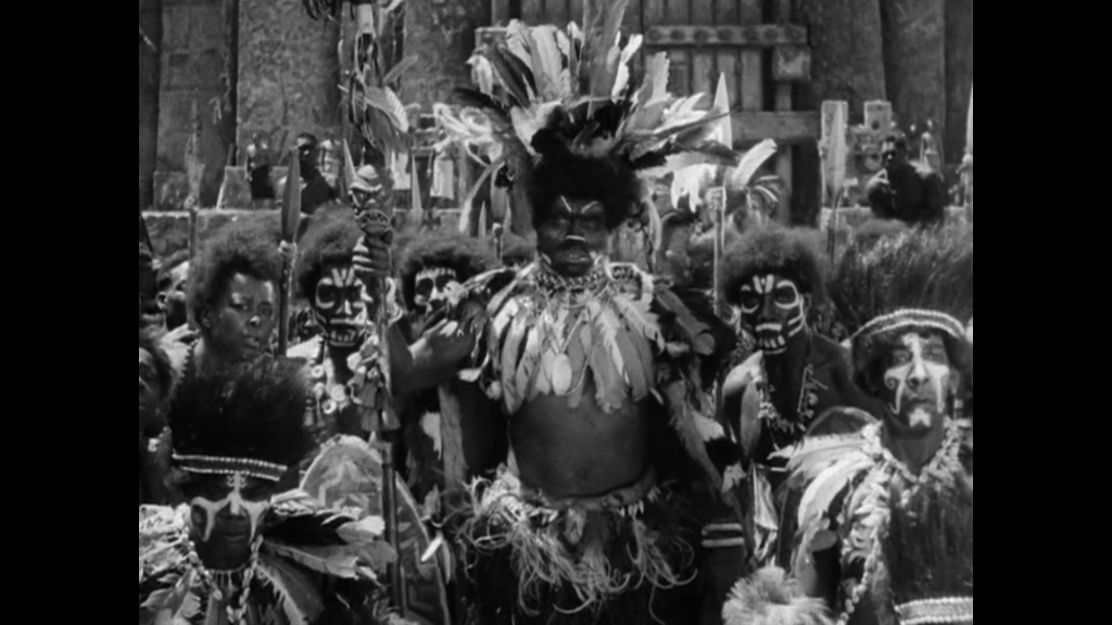 I also want to say a word about the natives. They’re what such characters usually were in those days of cinema; which is to say, they’re Black people in grass skirts and coconut bras, who are primitive and superstitious, able to be scared off by gunfire. At first glance, many would probably prefer the terrifying, Uruk-Hai-like natives of the Peter Jackson version, or the unsmiling utopian natives of Kong: Skull Island.