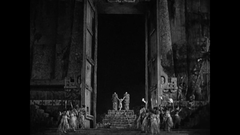 Me, I don’t like the natives in either of those films because I think they’re too simplistic and one-note. The ones in this film might be unlike any real native peoples, but they are people. They can be reasoned with, they have clear motivations, and they react to the things going on around them in an understandable way. There are little human details, like how when the chief marches down the steps to confront the visitors, a small child doesn’t get that he’s supposed to move until his parents yank him out of the chief’s way, or the behavior of the girl who was to be the original sacrifice; she isn’t struggling like Ann does, but she certainly doesn’t look happy and she kind of flinches whenever someone touches her. Contrast this with the Jackson film, where they natives are just movie monsters, or Skull Island, where they’re just colonial penance figures (oddly, the only other ‘Kong’ film I’ve seen that achieves something like this is King Kong vs. Godzilla, where the natives have a similar blend of primitive simplicity and frank humanity: “The chief says you can stay, but he will not be responsible if the monster comes down from the mountains and eats you up”).