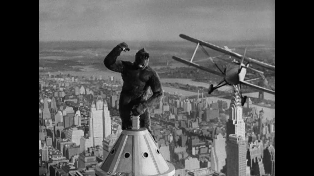 Driscall and Denham are soon the only survivors of the rescue operation and are separated. Driscall rescues Ann from Kong’s lair, while Denham regroups with the others. Kong pursues them to the village, breaks through the wall protecting it, and goes on a rampage until Denham stops him with a gas bomb. They take him back to New York and put him on display, but he’s enraged by the photographers’ flashbulbs and breaks free, pursuing Ann across the city and finally carrying her to the top of the Empire State Building, where he is killed in combat with airplanes.