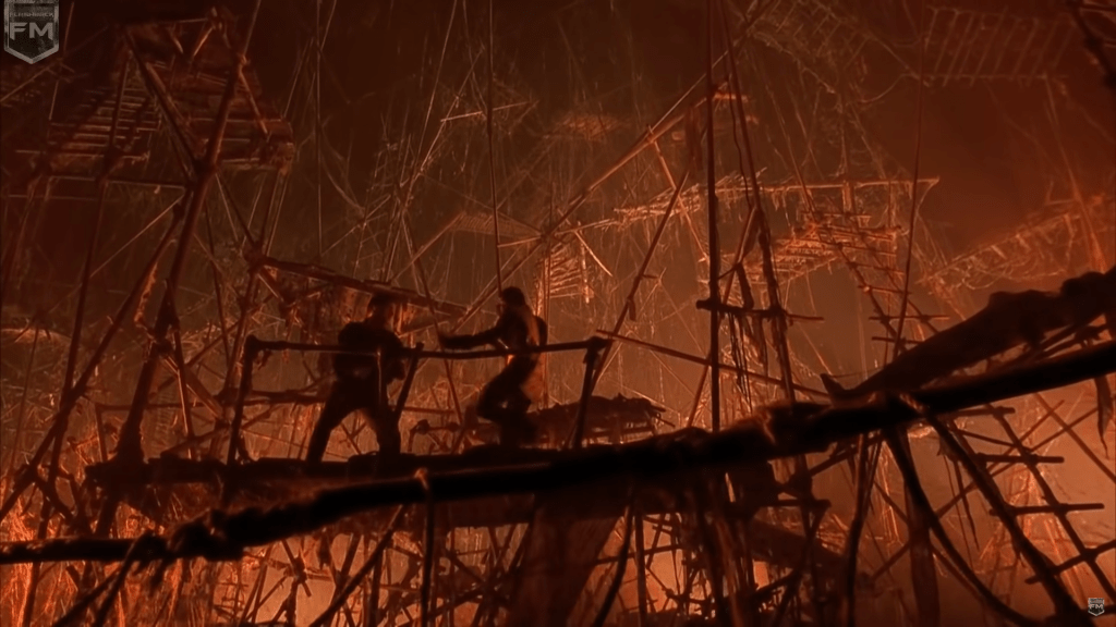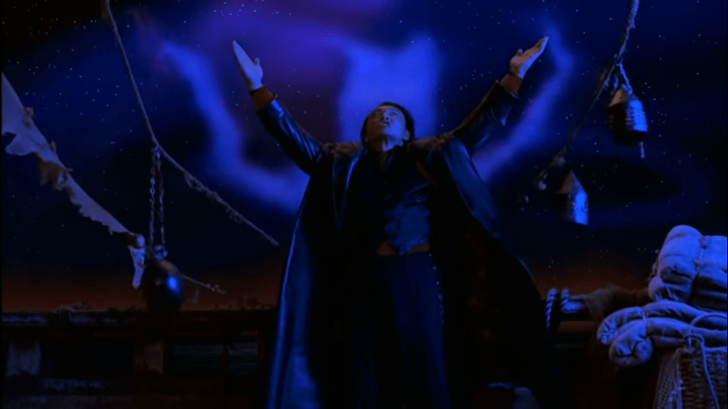All three eventually meet up on a boat bound for Shang Tsung’s island, where they will partake in the mystical tournament of Mortal Kombat. They get a taste of the kind of opposition they can expect when they come face-to-face with two of Shang’s enslaved champions: Scorpion and Sub-Zero, both of whom wield supernatural powers (Sub-Zero demonstrates his cryomancy by destroying Sonya’s pistol, swiftly removing any firearms from the film).