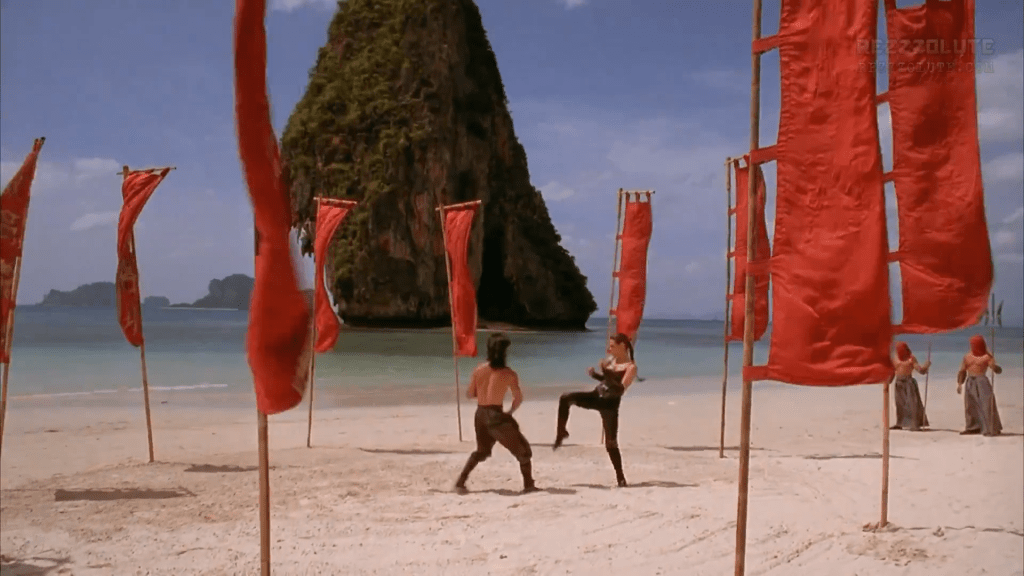 On the other side of the equation, the sets are gorgeous. These are really a high point of the film: towering, ornate banquet halls and palace corridors lined with statues, mountain-top temples, a fire-lit cavern filled with rickety platforms lined with skeletons, an eerie, smoke-filled chamber, lush beaches, and maze-like forests. Clearly a good chunk of the film’s modest budget went to constructing or traveling to interesting environments for the fights to take place in, which I would say is money well spent. At times the movie looks like it’s set in a Weird Tales cover.
