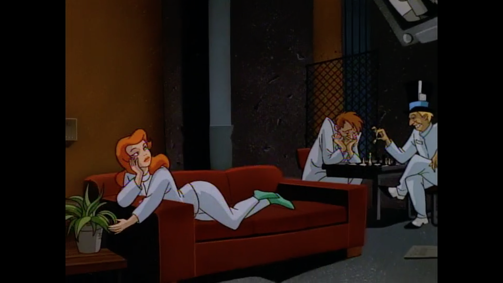 2. Watching the episodes, though, I was struck by how different this is from what has become the usual Batman fare, and even from the subsequent direction the character took in future shows ostensibly set in the same universe (New Batman Adventures, Justice League, etc). The stories here tend to be much more subdued and down-to-earth: ordinary crime stories and dramas (e.g. one episode has a ruthless tycoon planning to stage a gas explosion to clear out a neighborhood he wants to develop). Batman doesn’t always deal with supervillains, and even when he does the villains are themselves a bit more low-key than in other versions. Like, you’ll see scenes at Arkham where Joker, Poison Ivy, Mad Hatter, and Scarecrow are just hanging out in the lounge playing chess or watching TV while a couple of guards stand watch, occasionally intervening to break up a petty squabble. In other words, they’re…actual mental patients! A more contemporary Batman story would have all four under Hannibal-Lecter-style maximum security restraints and still murdering guards left and right.