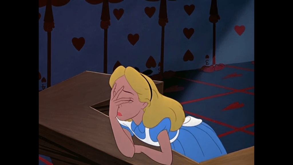 5. I think my favorite thing about the Disney adaptation, by the way, is just Alice herself. She’s trying to be sensible and polite, but is surrounded by lunatics and sometimes reacts accordingly (I love the bit at the trial when the Hatter and the March Hare start singing again and she just buries her face in her hands in exasperation). See, when you have one character who is more sensible, intelligent, and mature than everyone else, the thing to do is to make sure no one takes her seriously or pays the least attention to her, because that’s funny.