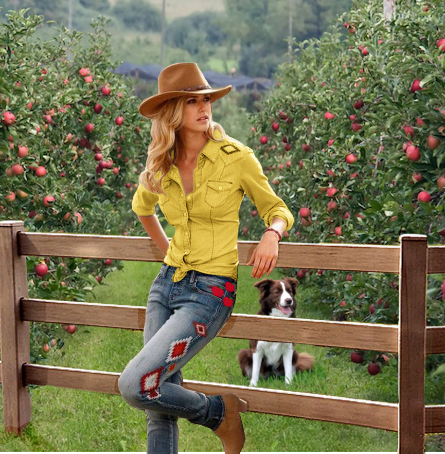 Applejack was another fairly easy one, once I found a suitable model (“Cowgirl model” was at least a meaningful search term). She mercifully has an actually natural hair color! Changing her shirt color was a pain, however, as was positioning her against the fence. As I remember, the model was originally leaning on something else: I think maybe a metal gate leading into a barn. I wanted her in an apple orchard, of course, so first I had to put the fence in, then the model, and then there was a good deal of shifting and adjusting to make them both sit naturally in the scene, then drawing in the shadows (which, now that I look at it, are still off: I didn’t take good account of the direction of the light).