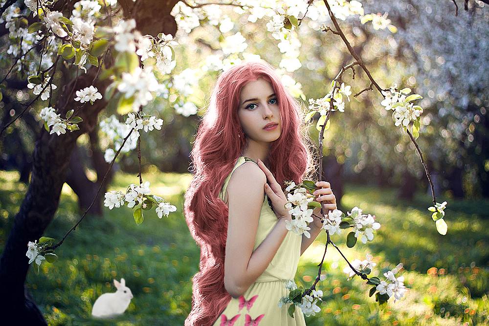 Still pretty pleased with this. It helps that she was one of the easier ones, since she’s the only one who didn’t need to be pasted into a new environment. All that was really necessary was to change her hair and dress color, make the hair longer (not that it was short to begin with, just that Fluttershy’s hair is very long), and add in the cutie mark. Then I decided to stick Angel Bunny in there with her, just to add more interest to the scene.