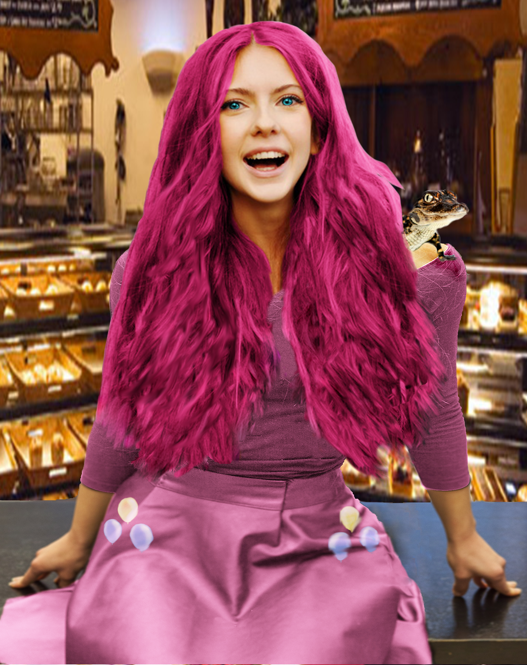 She’s the only one who’s a composite figure. After a lot of searching, I finally found an excellent image of a laughing redhead…except that it was a portrait and I needed the whole body (and why do so many models pose with that same blank, neutral expression? And if they are smiling, it’s usually an arch, knowing smile of the kind that Pinkie would never use in her life!). So I found another picture of a model sitting on a counter (which worked with the pastry shop background) and stuck the head of the one on the body of the other.