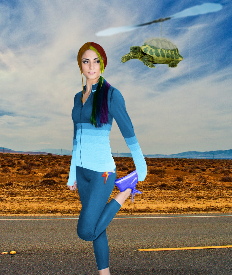 I have mixed feelings about this one. I think the model was a good choice: she’s got a nicely focused, confident look to her that fits Rainbow Dash. But I don’t like the environment. My thought was that her setting was the sky, so I should have as big a sky as possible, but in hindsight I should have put her in a stadium or on an athletic field. It looks too empty and bare like this. Also, Tank is pretty wonky here; he looks like he’s about to fly into her.