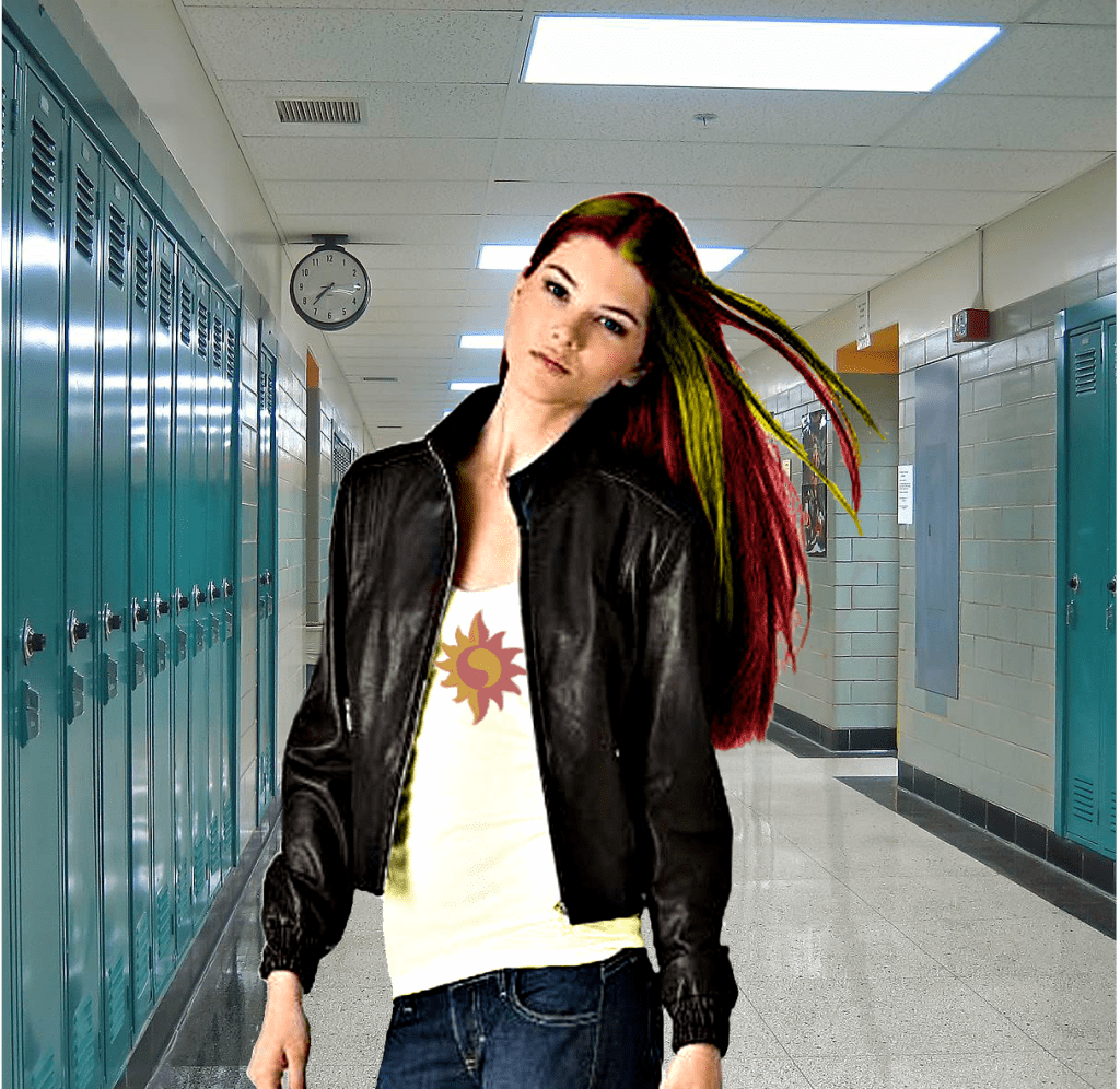 But her shirt looks awful (changing the color when there’s a big dark shadow on part of it is a nightmare) and the image resolution on the model is much too low: I should have found a bigger picture to work with. Oh, and the environment is hideous, and while that fits for a public high school, I don’t like it in my pictures. Should have tried to find one that was at least moderately photogenic.