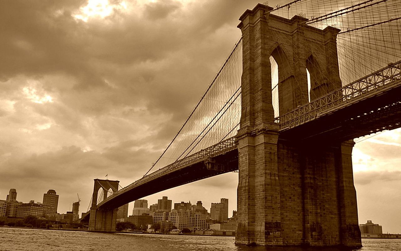 Part of the process of building the Brooklyn Bridge (as with other, similar structures) involved sinking pressurized caissons made of reinforced timber into the East River so that workers could dig the foundations into the river bottom. The caissons go to the bottom, are pressurized to the level of the surrounding water to keep them dry, and the workers go down to slowly sink the things into the ground. Then the two support towers were built on top of them (so, yes, the Brooklyn Bridge sits on wooden foundations. Southern pine, to be precise. They were over-engineered to hell and back to make sure they could take it; an accident during construction resulted in one of the half-finished towers dropping nearly five times the expected pressure on one of them, and it stood up with only a few cracks).