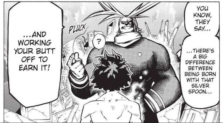 (I’m positive this is coincidence, but I can’t help noticing that Hachiken-san’s demands take the form of incessant study and reading, while All-Might’s involve eating a portion of his flesh and building on the resulting gift…)
