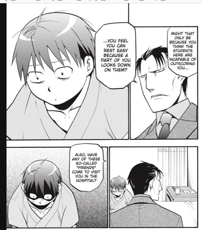 In Silver Spoon, Yugo’s main reason for coming to the farming school was to get away from his terrifying, demanding father, who expects his sons to excel and shows nothing but contempt when they fall short, even to the point of simply not getting top grades. He doesn’t shout or rage at them; he simply regards them with brutally cold disdain as he verbally tears down their excuses or pleas.