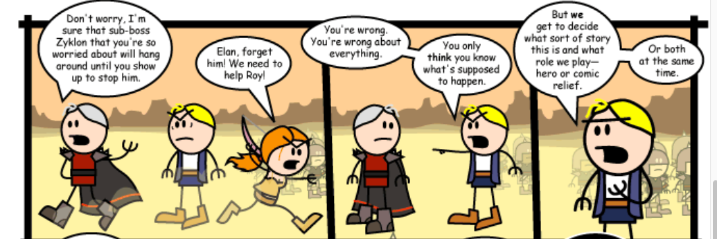 Tarquin doesn’t show up until the second half of the extremely-long-running (and still on-going) comic. To give a quick summary, Elan is the titular party’s bard, a dim-witted, childish, but lovable comic relief who spends a lot of time making self-aware comments on story structure. He has an evil twin named Nale who has been a recurring secondary-villain up to this point. Tarquin, it turns out, shares Elan’s awareness of storytelling tropes and applies them as a strategist, which has allowed him to become the de-facto ruler of several successive puppet empires.