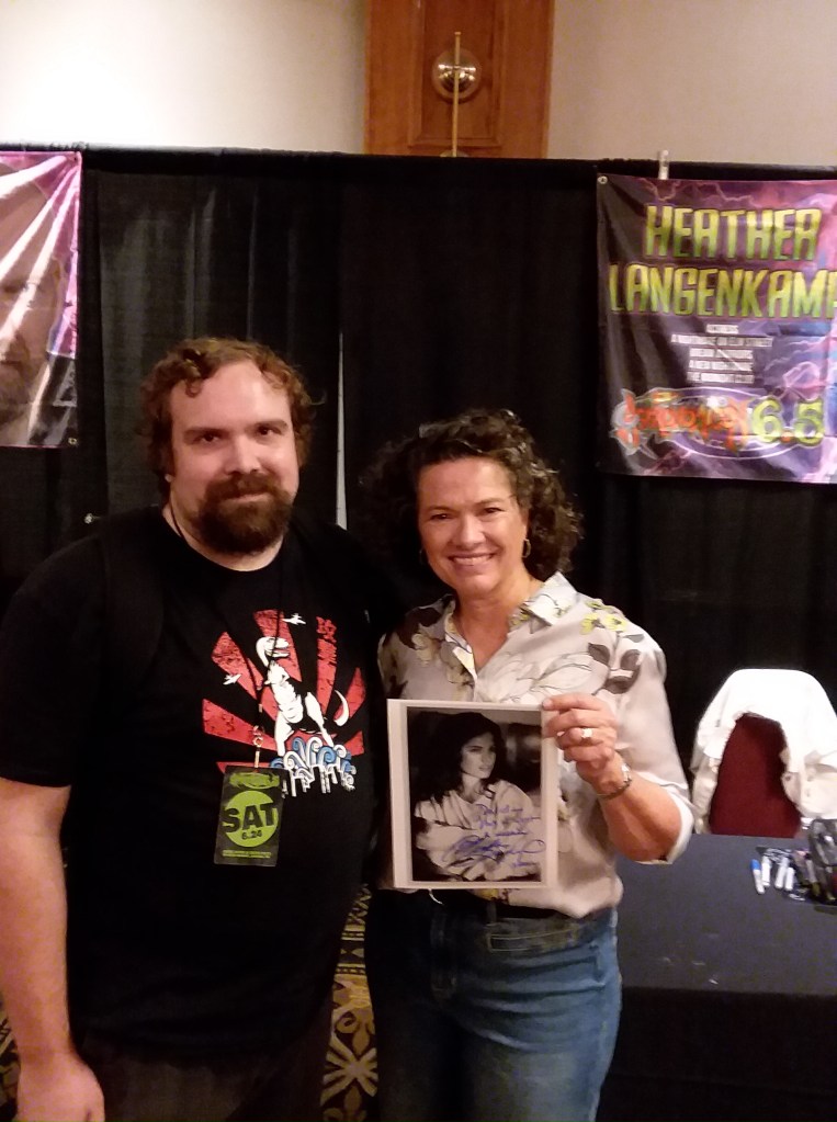 Yesterday I got to satisfy a long-held wish. Pretty much ever since I first saw A Nightmare on Elm Street – which is still one of my favorite horror films – I’d hoped to have the chance to meet the lovely Heather Langenkamp, who plays protagonist Nancy. See, I’m one of those odd people who saw the film and thought “Okay, Freddy’s a good villain and all, but wow, Nancy’s awesome!” And the best part of the film, the one that sticks most in my mind to this day, was the ending, where she defeats Freddy by turning her back on him and refusing to believe in him or give him any power over her (it’s a strong enough climax to remain impactful even after they tack on an utterly horrible ‘shock’ ending afterwards that undoes it. I’ve actually edited my own version of the film to have the original ending, but that’s another story).