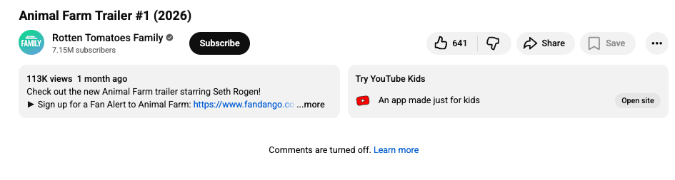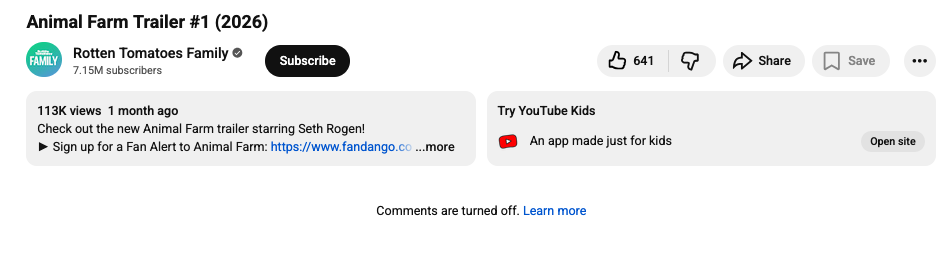 1. I subjected myself to the trailer for Andy Serkis’s Animal Farm, which looks incredibly bad in itself and to be a flat-out insult as an adaptation. The only joy in the experience came from looking at the video numbers: